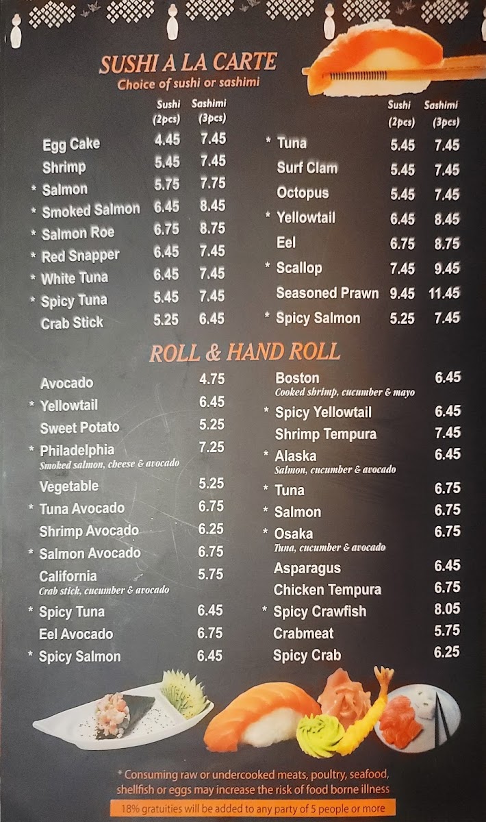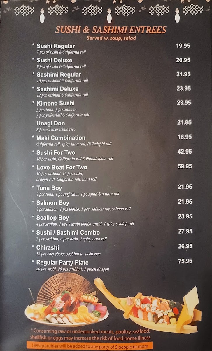 18 pcs sushi, California roll and Philadelphia roll. Served with soup and salad.